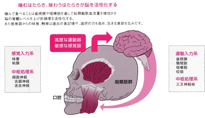 要介護者に入れ歯を入れたところ、車いすから立ち上がったり、歩けるようになったという報告があります。また、入れ歯を入れてゲートボールをした時の的中率は、入れ歯を外した時に比べて大差が出ることがわかっています。体を保つ平行感覚機能は噛む筋肉(咀嚼筋)の左右のバランスが、全身の筋肉のバランスに影響を与えているのです。